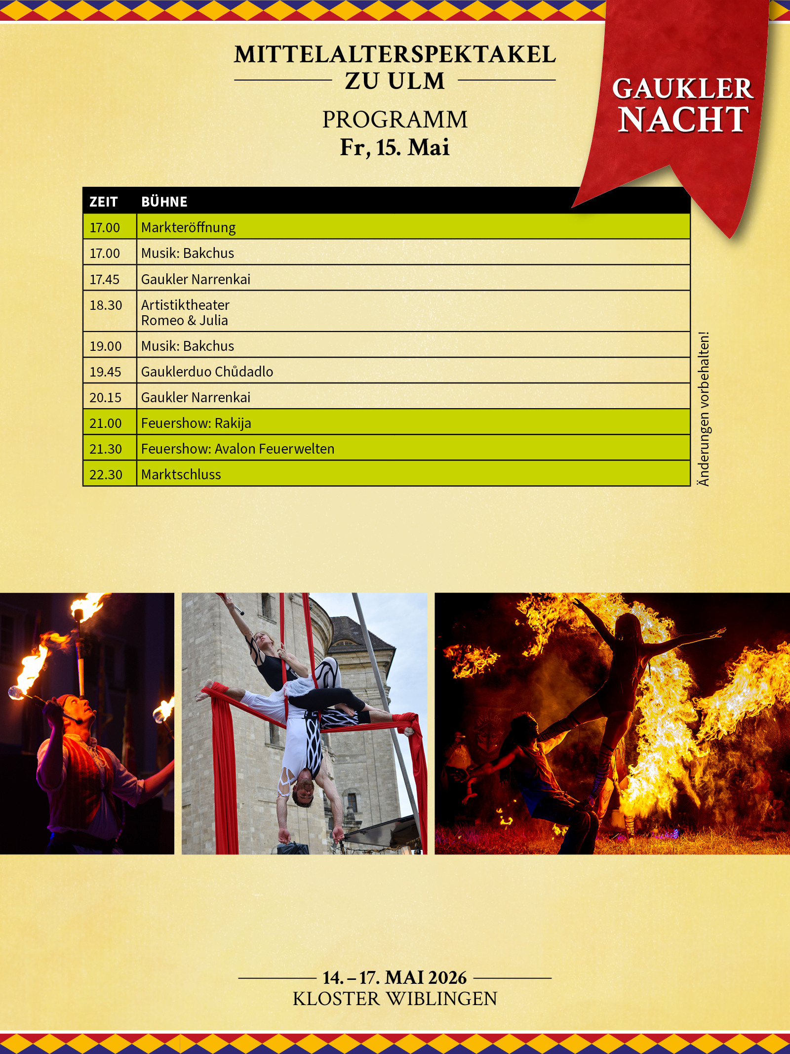 Am 15. Mai 2026 wird das Kloster Wiblingen zur Bühne für ein unvergessliches Spektakel! Erlebt mitreißende Gauklerkunst, faszinierende Feuershows und mitreißende mittelalterliche Klänge!
